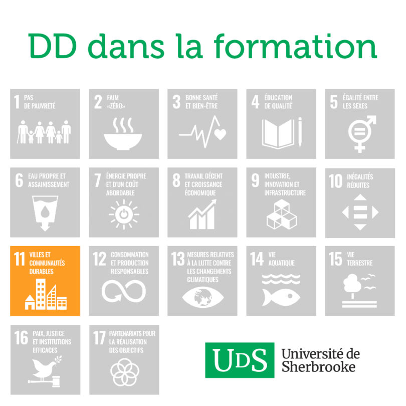 Découvrez la 8e initiative de la série qui illustre, chaque mois, l’intégration du développement durable dans la formation à l’UdeS, par l’entremise d’initiatives et d’exemples liés à l’un des 17 objectifs de développement durable (ODD) de l’ONU. Les initiatives dans le présent texte mettent en valeur l’ODD 11 – Villes et communautés durables.