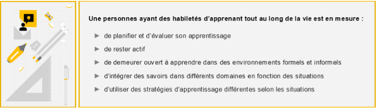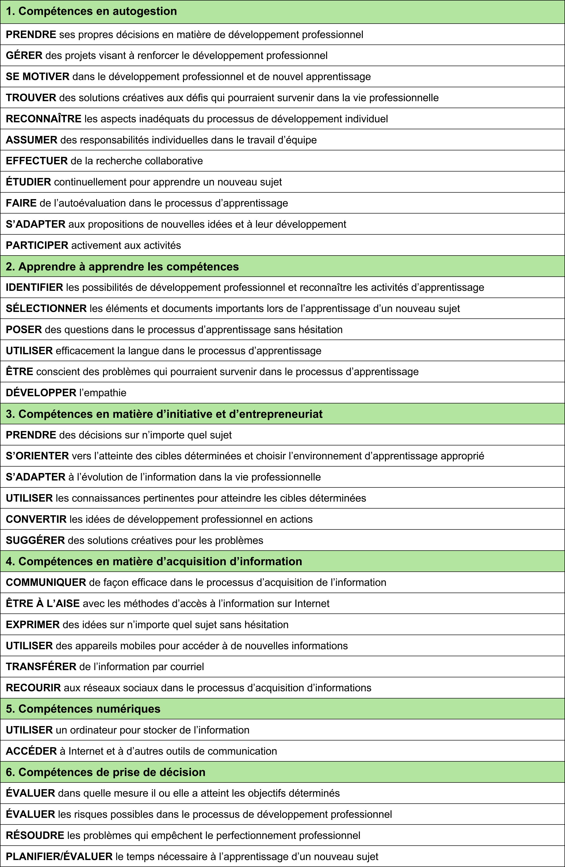 L’auteur rapporte également les travaux de Hürsen (2011), qui identifie six compétences principales pour le développement de l’apprentissage tout au long de la vie :