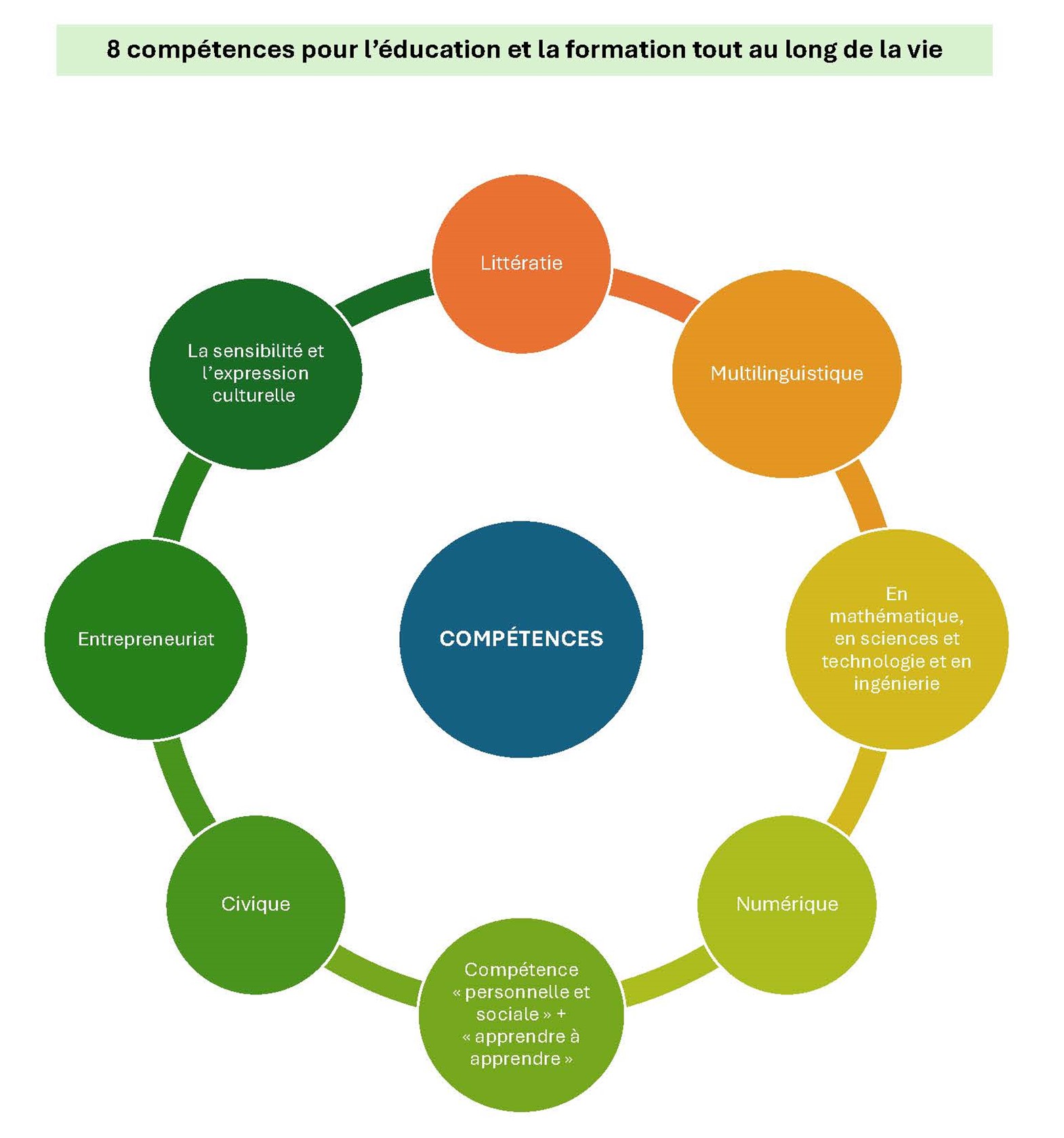 Quant à la Commission Européenne (2019, 2007), elle identifie huit (8) compétences pour l’éducation et la formation tout au long de la vie :