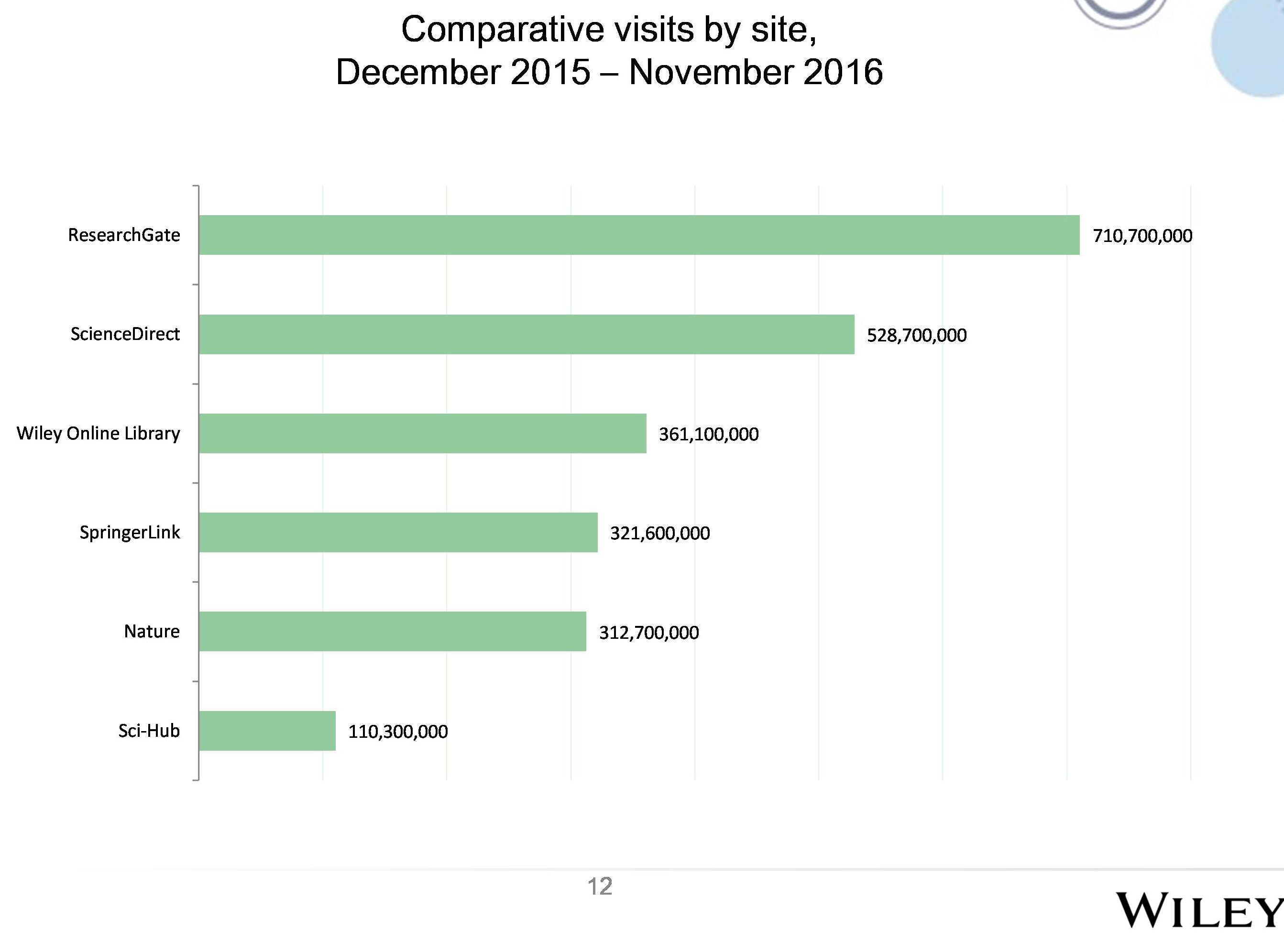 Dans un coin, il y a ResearchGate, un réseau de collaboration savante (Scholarly Collaboration Network – SCN). C’est LE réseau de collaboration savante le plus populaire, avec un niveau de circulation phénoménal, comme en fait foi cette diapo tirée d’une présentation faite en janvier dernier par Philip Carpenter (de John Wiley & Sons) à la conférence Academic Publishing in Europe (APE) :