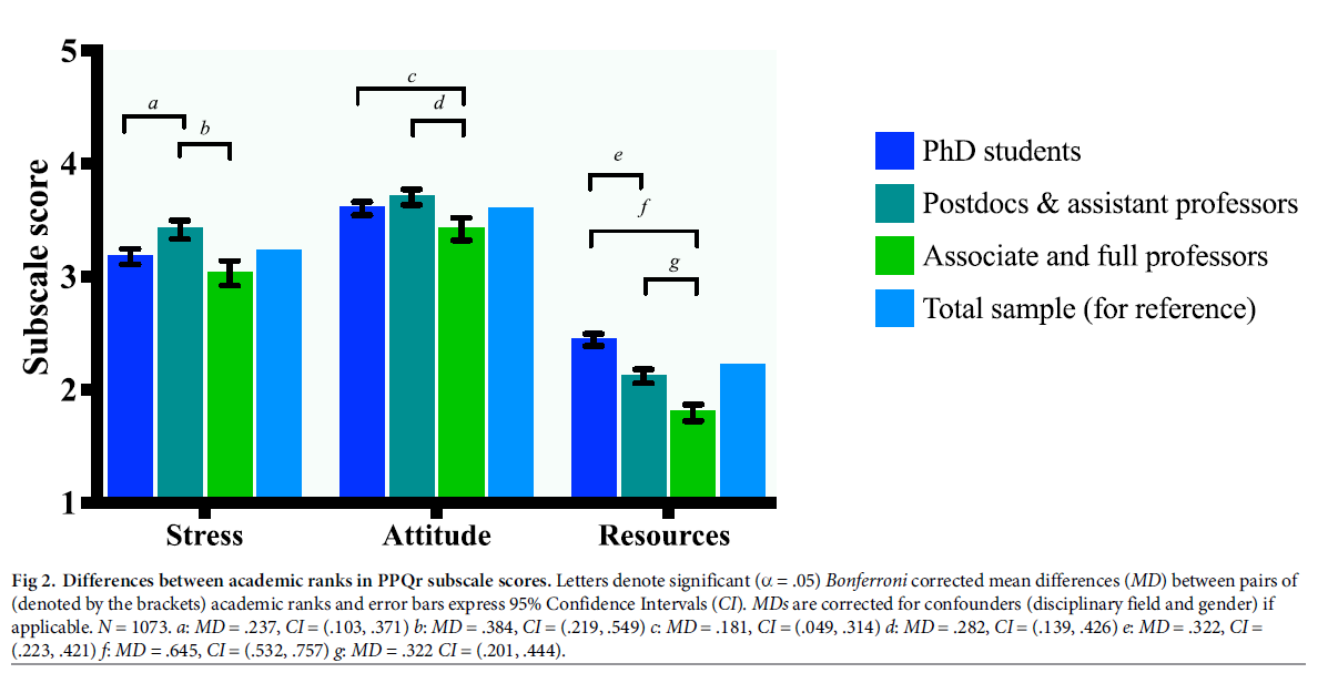 “Overall, there is a negative attitude towards the publication climate. Hence the ‘publish or perish’ mantra from the late 20th century may turn into ‘publish and perish’, since even when a researcher publishes reasonably, chances for tenure in academia may still be low [20,34,35]. Below we elaborate on the differences of effect sizes that were medium or above or on those where we found interaction effects [33].”