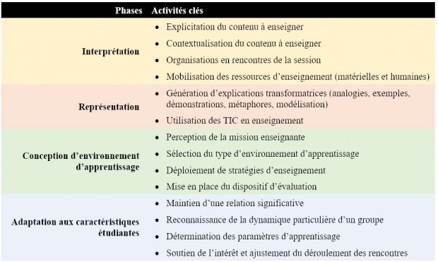 Ainsi, savoir-enseigner en contexte universitaire serait un processus didactique comprenant 4 phases, auxquelles sont associées des activités clés.
