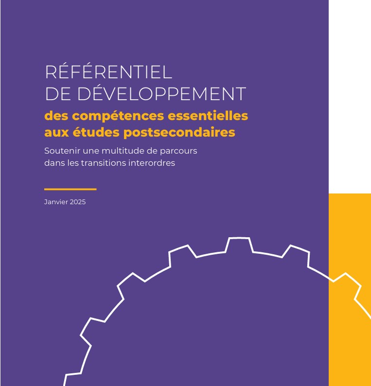 Demers, S., Veilleux, M., Bélec, C., Tardif, S., Stockless, A., Parent, S., Michaud, N., Desjardins, F., Martin-Roy, S., et Staiculescu, R. (2025). Référentiel de développement des compétences essentielles aux études postsecondaires. Université du Québec. https://reseau.uquebec.ca/system/files/documents/referentiel-developpement-competences-essentielles-etudes-postsecondaires-20250331.pdf